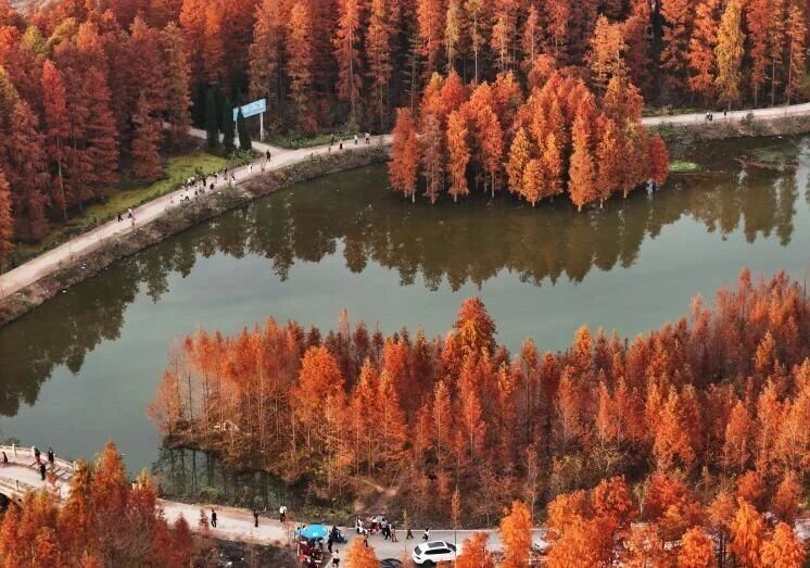 初冬時(shí)節(jié),在位于河南省東南部固始縣的楊店林區(qū)(國(guó)家級(jí)公益林),連片的水杉經(jīng)霜露浸染,換上了丹紅的新裝。陽光穿過枝葉,灑落下斑駁的光影,為冬日的林區(qū)增添了幾分暖意與詩(shī)意。