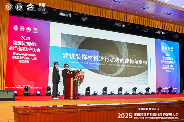 集美組設(shè)計(jì)機(jī)構(gòu)聯(lián)合創(chuàng)始人、資深設(shè)計(jì)師、藝術(shù)家林學(xué)明、廣州美術(shù)學(xué)院教師凌敬淇帶來(lái)了主題為“2025 裝飾材料流行趨勢(shì)的建構(gòu)與重構(gòu)”的精彩分享,為參會(huì)者揭示了未來(lái)裝飾材料的發(fā)展方向。