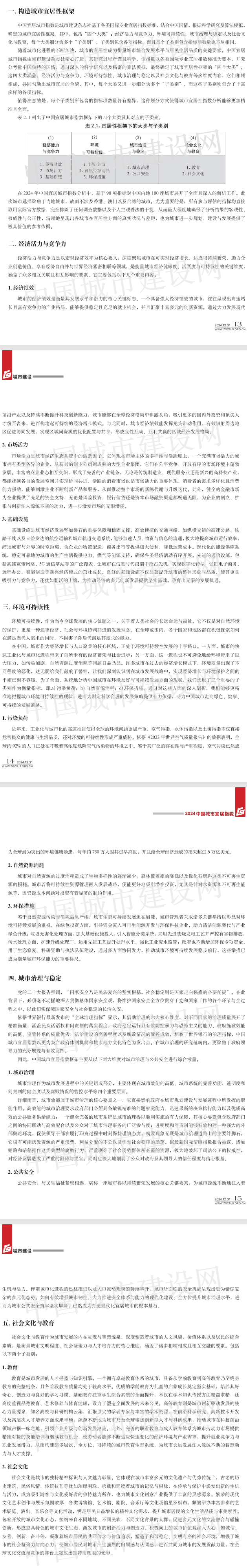 中國宜居城市指數(shù)是城市建設(shè)雜志社基于各類國際專業(yè)宜居指數(shù)標準,結(jié)合中國國情,根據(jù)科學(xué)研究及算法模擬, 確定的城市宜居性框架。其中,包括“四個大類”:經(jīng)濟活力與競爭力、環(huán)境可持續(xù)性、城市治理與穩(wěn)定以及社會文 化與教育。每個大類細分為多個“子類別”,子類別包含各項指標,而且每個子類別包含指標項數(shù)量也不盡相同。