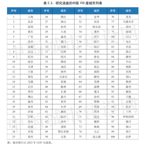 表2.2詳細(xì)列出了本研究選取的100座中國(guó)城市清單。實(shí)驗(yàn)研究數(shù)據(jù)以2022年為基準(zhǔn),需要特別說明的是, 本研究若存在數(shù)據(jù)缺失情況,則以2021年數(shù)據(jù)為準(zhǔn);同時(shí),研究范圍未涵蓋香港、澳門以及臺(tái)灣地區(qū)。