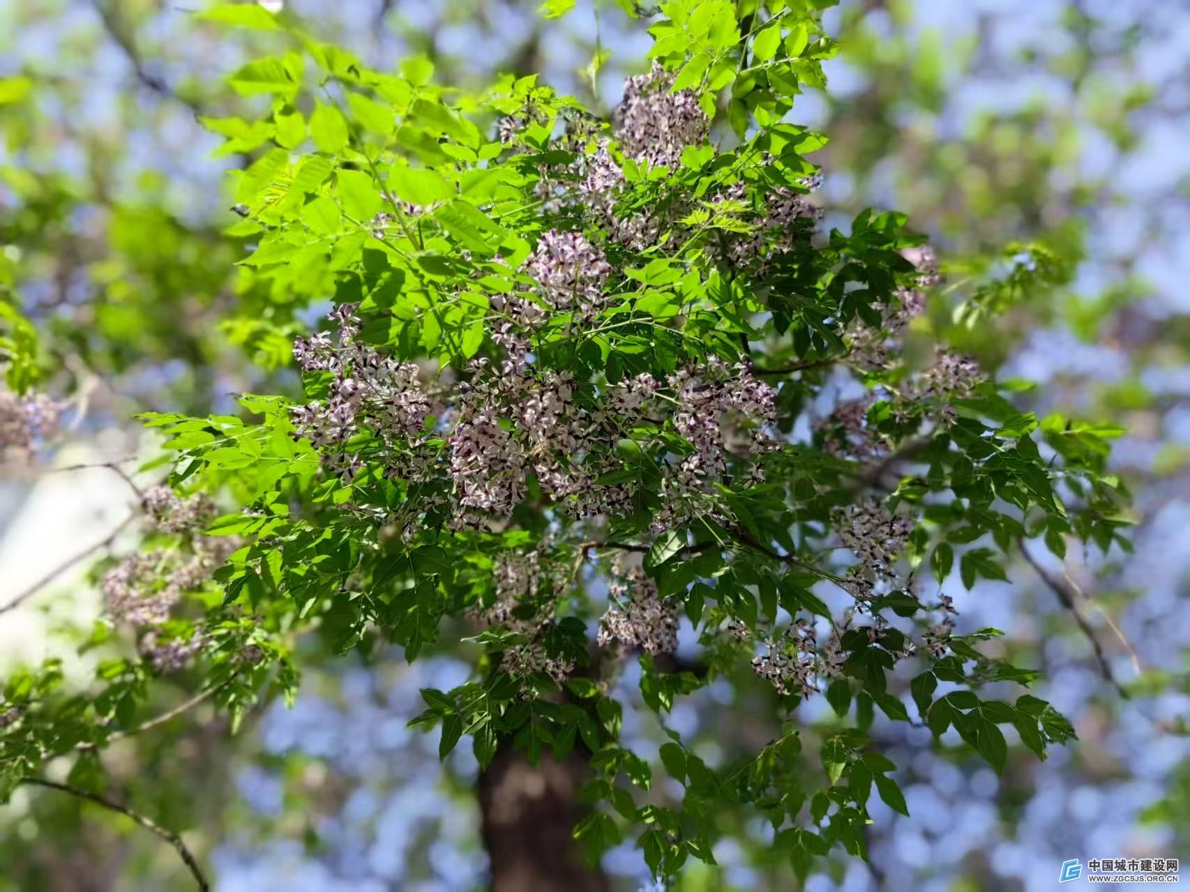 在千米長(zhǎng)的道路兩側(cè),生長(zhǎng)著上百棵苦楝樹(shù),高大的苦楝樹(shù)枝干交錯(cuò),遮天蔽日,為休閑的人們帶來(lái)一片清涼。每到四月中下旬,枝葉發(fā)榮滋長(zhǎng),紫色花蕾競(jìng)相綻放,濃郁的花香沁人心脾,讓人神清氣爽、心曠神怡。
