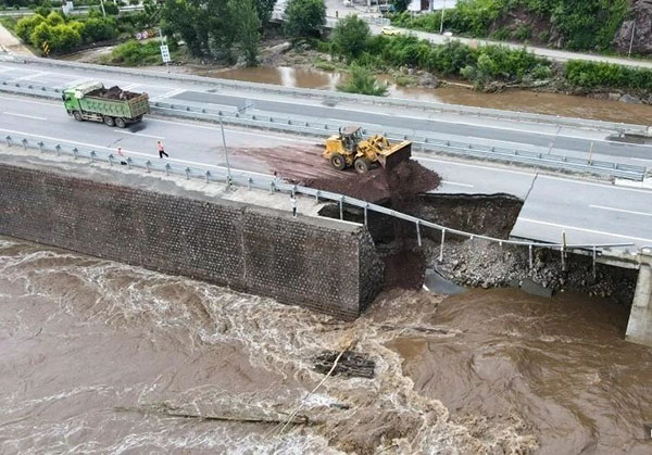 7月28日,北京市懷柔區(qū)111國道古石溝門橋因為連日暴雨導(dǎo)致路基被沖毀,大型工程機械在回填路基,加快搶修。