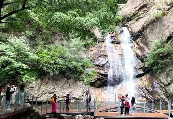 近日,陜西西安遭遇持續(xù)高溫天氣。位于秦嶺腹地的太平國家森林公園內(nèi)“飛瀑”壯觀迷人,山間草木蔥蘢,不少游人前來避暑、游玩,享受獨屬秦嶺山間的“清涼感”。圖為游人在秦嶺“飛瀑”前游玩。