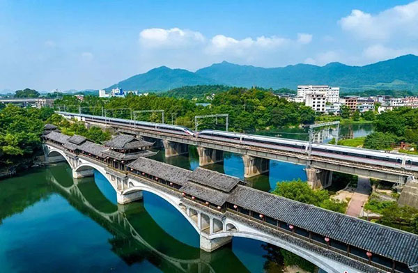 近日,廣西桂林市靈川縣甘棠江,飛馳的列車行駛在湘桂線大橋上,與風雨橋、河流、樓房及綠色的公園相映成趣,構成一幅美麗畫卷。