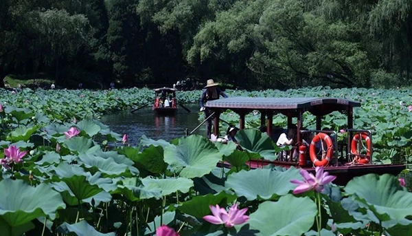 8月10日,市民在北京紫竹院公園“荷花渡”景區(qū)乘船欣賞盛開(kāi)的荷花,享受“船在水中行,人在荷中游”的美景。正值暑期,在紫竹院公園乘船賞荷成為市民休閑避暑的好去處。