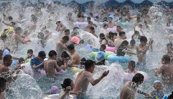 8月9日,重慶市民在水上樂(lè)園戲水覓清涼。連日來(lái),重慶持續(xù)高溫天氣,位于重慶涪陵的美心紅酒小鎮(zhèn)水上樂(lè)園推出潑水節(jié)、音浪節(jié)等活動(dòng),吸引市民清涼消暑。