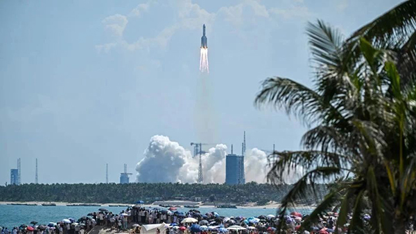 8月13日14時43分,中國在文昌航天發(fā)射場使用長征五號乙運載火箭/遠(yuǎn)征二號上面級,成功將衛(wèi)星互聯(lián)網(wǎng)低軌08組衛(wèi)星發(fā)射升空,衛(wèi)星順利進(jìn)入預(yù)定軌道,發(fā)射任務(wù)獲得圓滿成功。圖為民眾在文昌淇水灣海灘觀看長征五號乙運載火箭/遠(yuǎn)征二號上面級點火升空。