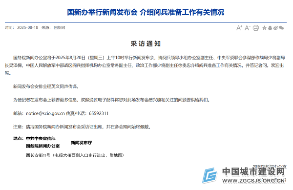 國務(wù)院新聞辦公室將于2025年8月20日(星期三)上午10時(shí)舉行新聞發(fā)布會(huì),請閱兵領(lǐng)導(dǎo)小組辦公室副主任、中央軍委聯(lián)合參謀部作戰(zhàn)局少將副局長吳澤棵,中國人民解放軍中部戰(zhàn)區(qū)閱兵指揮機(jī)構(gòu)辦公室常務(wù)副主任、政治工作部少將副主任徐貴忠介紹閱兵準(zhǔn)備工作有關(guān)情況,并答記者問。