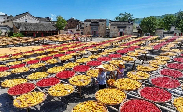 8月18日,安徽省黃山市徽州區(qū)呈坎古村迎來(lái)了一年一度的“曬秋”盛景。村民們趁著晴好天氣,將玉米、南瓜、紅辣椒等農(nóng)作物鋪滿曬場(chǎng)。五彩斑斕的農(nóng)作物與徽派古建交相輝映,構(gòu)成一幅五谷豐登的秋收畫卷,吸引眾多游客前來(lái)感受豐收的喜悅。