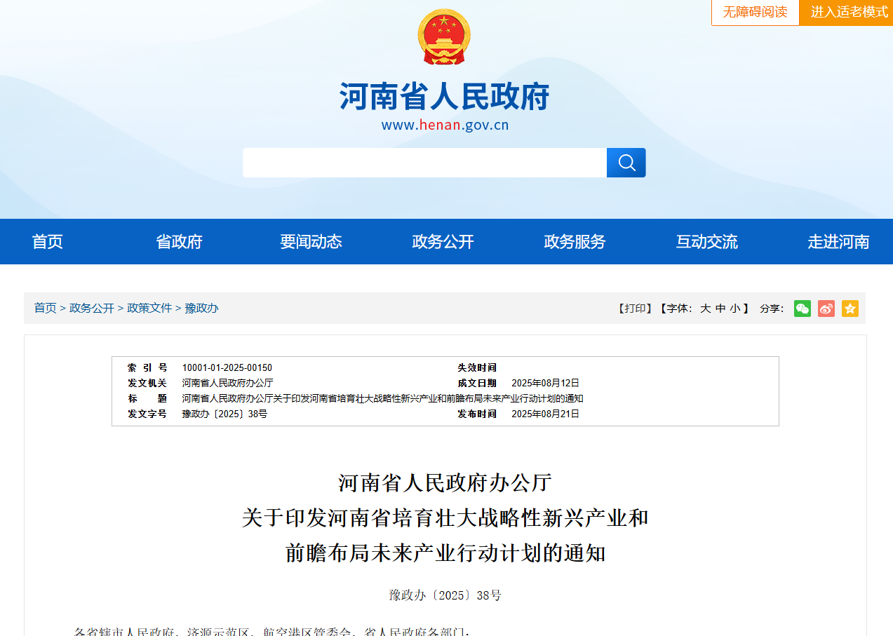 8月21日,記者從河南省人民政府網(wǎng)獲悉,河南省人民政府辦公廳關(guān)于印發(fā)河南省培育壯大戰(zhàn)略性新興產(chǎn)業(yè)和前瞻布局未來產(chǎn)業(yè)行動計劃的通知(下稱“通知”),旨在加快培育戰(zhàn)略性新興產(chǎn)業(yè)成為支柱產(chǎn)業(yè),推動未來產(chǎn)業(yè)逐步成為新經(jīng)濟(jì)增長點,打造產(chǎn)業(yè)接續(xù)發(fā)展新引擎,因地制宜發(fā)展新質(zhì)生產(chǎn)力。