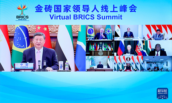 9月8日晚,國家主席習近平出席金磚國家領(lǐng)導(dǎo)人線上峰會,并發(fā)表題為《團結(jié)合作 砥礪前行》的重要講話。巴西總統(tǒng)盧拉主持峰會,俄羅斯總統(tǒng)普京、南非總統(tǒng)拉馬福薩、埃及總統(tǒng)塞西、伊朗總統(tǒng)佩澤希齊揚、印度尼西亞總統(tǒng)普拉博沃、阿聯(lián)酋阿布扎比王儲哈立德以及印度、埃塞俄比亞代表與會。