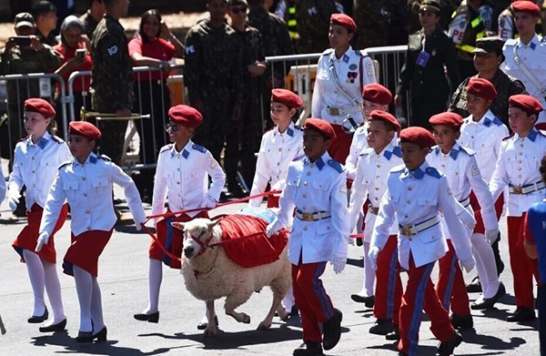 當?shù)貢r間9月7日,巴西獨立203周年慶典活動在首都巴西利亞舉行。巴西總統(tǒng)盧拉當天檢閱了參加閱兵式的巴西海陸空三軍、裝甲部隊、憲兵、聯(lián)邦警察、消防部隊和飛行表演隊,并觀看了社會各界組織的游行活動。圖為一群少年牽著小羊參加獨立日游行。