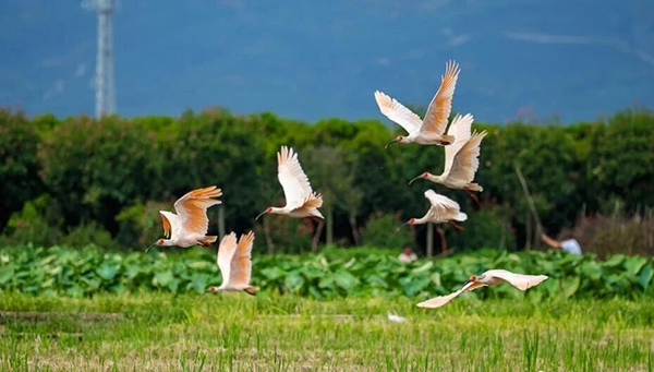 金秋時節(jié)秦巴稻田內朱鹮愜意飛舞