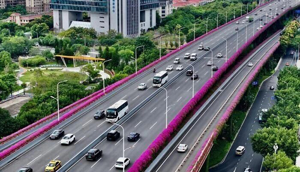 9月22日,空中俯瞰福建福州林浦互通立交橋。金秋九月,福州城區(qū)許多高架橋上的三角梅競相綻放,形成一條條空中花廊,為城市景觀增添色彩。