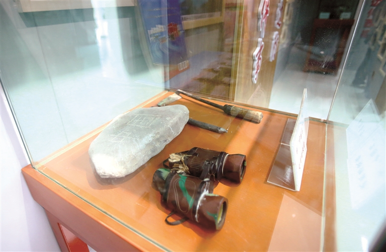 圖為“人民楷?!辈既悻敽埂っ斩溲策夁吘硶r刻下的“中國石”和使用的工具。 新華社記者 程麗 攝