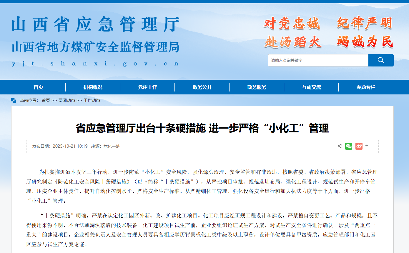 為扎實推進(jìn)治本攻堅三年行動,進(jìn)一步防范“小化工”安全風(fēng)險,強(qiáng)化源頭治理、安全監(jiān)管和打非治違,山西省應(yīng)急管理廳近日研究制定《防范化工安全風(fēng)險十條硬措施》(以下簡稱 “十條硬措施”),從項目審批、選址布局、過程管理到執(zhí)法監(jiān)管等十個關(guān)鍵環(huán)節(jié)入手,對“小化工”管理再敲“警鐘”,從嚴(yán)筑牢安全防線。