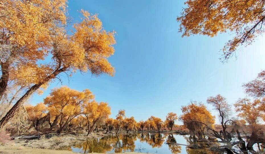 11月初,新疆沙雅縣470萬(wàn)畝胡楊進(jìn)入年度最佳觀(guān)賞期。塔里木河河水如綠絲帶纏繞其間,金黃的枝葉倒映水中,壯美景觀(guān)吸引游客觀(guān)賞。