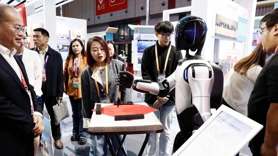 11月6日,人們在第八屆進博會國家展中國館觀看交互服務(wù)機器人寫書法。11月5日,第八屆中國國際進口博覽會在上海開幕。本屆進博會上,中國館展示中國“十四五”期間全面深化改革、推進高水平開放的最新成就,眾多科技成果尤為引人矚目。