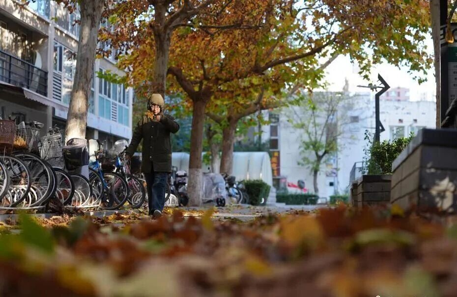 11月16日,在北京一居民小區(qū)內(nèi),地上掉有大量落葉。受寒潮影響,北京遭遇大風降溫天氣。
