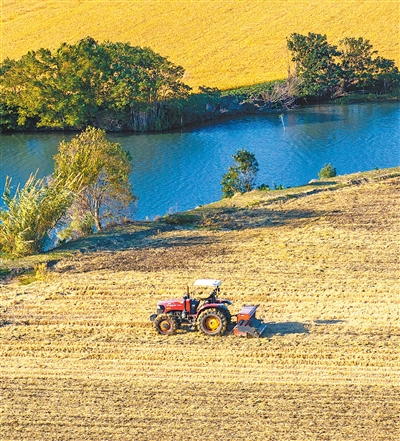 圖為11月19日,農(nóng)機(jī)在江蘇省興化市陳堡鎮(zhèn)蔣莊村田間播種冬小麥。
