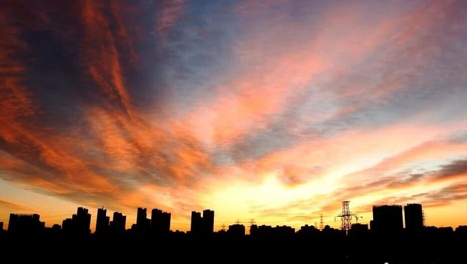 11月20日,初冬時(shí)節(jié),北京天空的朝霞絢爛壯麗、十分震撼,宛若一幅濃墨重彩的油畫(huà),美不勝收。