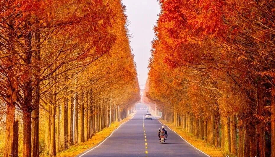 2025年12月8日,浙江嵊州,三界蔣鎮(zhèn)紅杉公路美如畫。