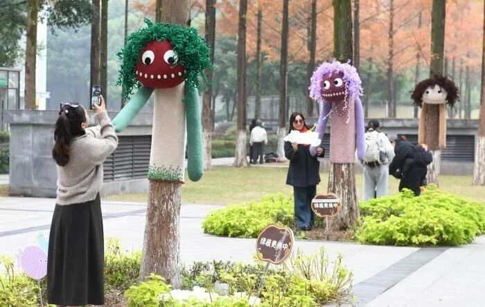 12月9日,重慶渝興廣場(chǎng),一棵棵“穿”上卡通外衣的大樹吸引市民前往打卡。據(jù)了解,大樹的卡通外衣由羊毛氈、毛線、扭扭棒等材料編織而成,萌趣十足暖意濃。