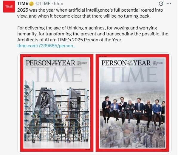 據(jù)美聯(lián)社報道,當(dāng)?shù)貢r間11日,“人工智能(AI)締造者們”被美國《時代》周刊評為2025年年度人物。《時代》周刊表示,“因為開啟‘思考型機器’的時代、讓全人類驚嘆亦憂慮、改變當(dāng)下并突破可能性的界限,‘AI的締造者們’當(dāng)選為《時代》2025年年度人物?!?