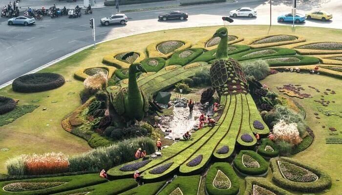 12月11日,江蘇南京,園林部門工作人員在鼓樓廣場“孔雀”綠雕處忙碌。近日,當(dāng)?shù)鼐G化園林部門對“孔雀”綠雕各個部位及內(nèi)部結(jié)構(gòu)加固維修,換上“冬裝”。