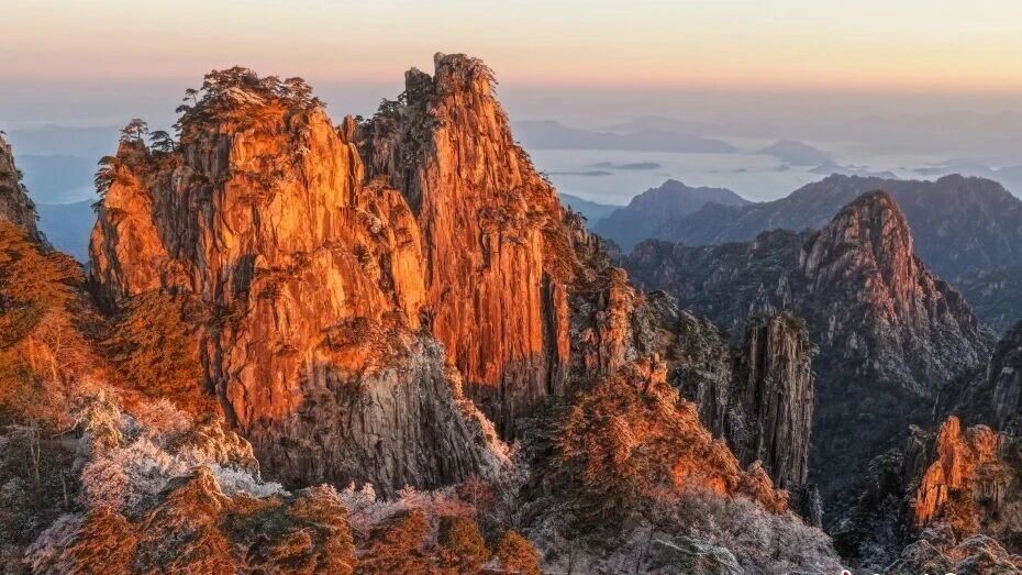 12月14日,雪后初霽的黃山風(fēng)景區(qū),絢麗日出與奇松、怪石交相映襯,熠熠生輝,吸引眾多游客前來賞雪觀景。