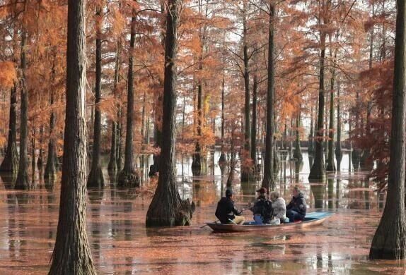 12月14日,湖北武漢,位于新洲區(qū)的漲渡湖濕地在冬日呈現(xiàn)出獨(dú)特的自然奇觀。萬余棵池杉樹葉金黃,色彩斑斕的“水上森林”鷺鳥翔集,林水相依,構(gòu)成一幅色彩斑斕的生態(tài)畫卷。圖為游客乘船在漲渡湖濕地“水上森林”中游玩。