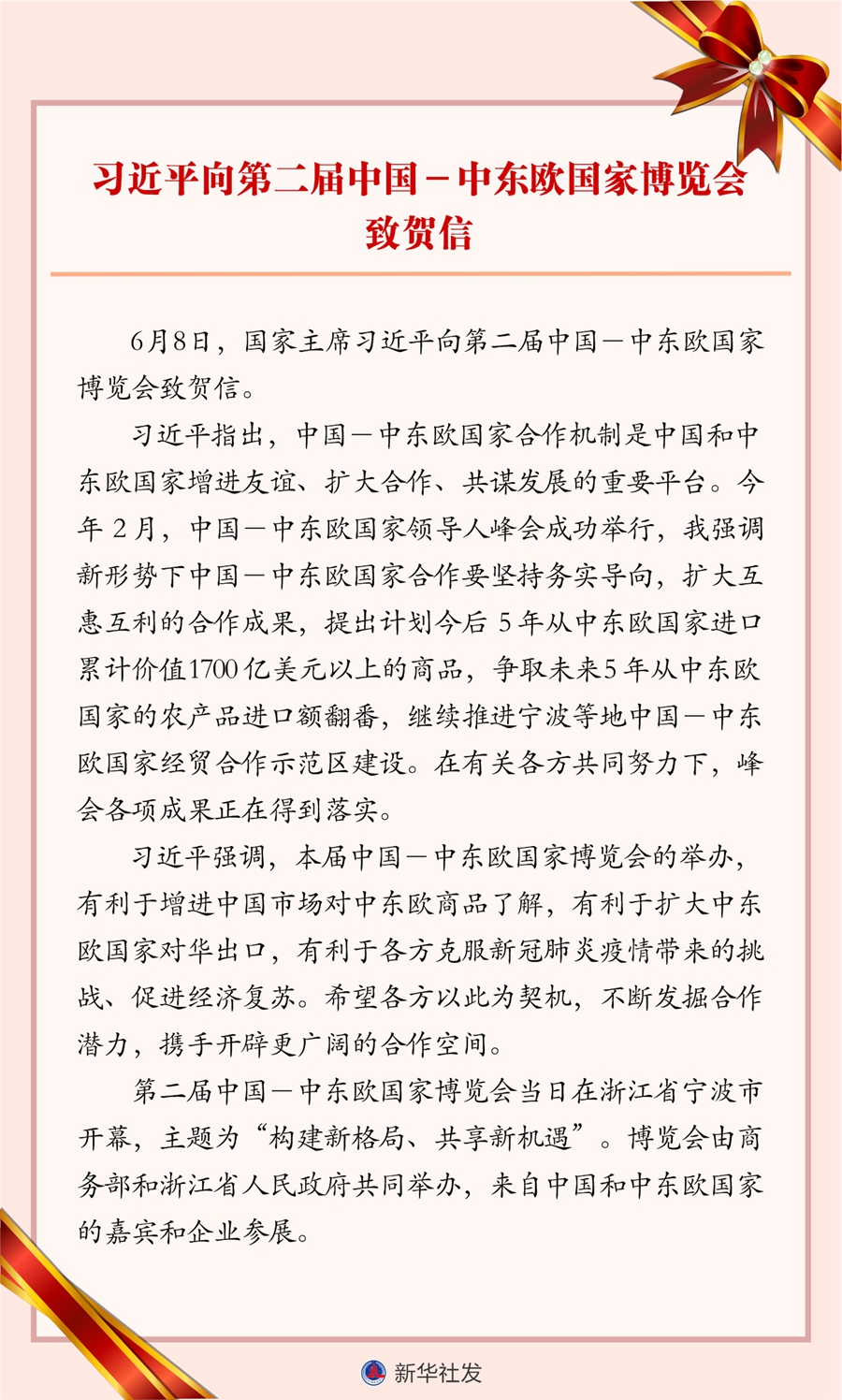 新華社北京6月8日電 6月8日,國家主席習(xí)近平向第二屆中國-中東歐國家博覽會致賀信。