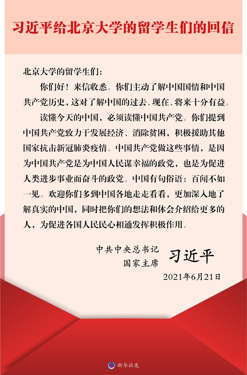 新華社北京6月22日電 中共中央總書記、國家主席習近平6月21日給北京大學的留學生們回信,鼓勵他們更加深入地了解真實的中國,把想法和體會介紹給更多的人,為促進各國人民民心相通發(fā)揮積極作用。