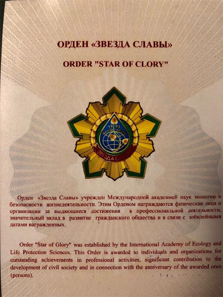 Care of people, care of environment, Prof. Chen’s ideas has shown the way of the sustainable development to many countries across the world. In 2018, Dr. Oleg Nicolaevich Rusak, the President of International Academy of Ecology and Life Protection Sciences of United Nation awarded Prof. Chen the Order “Star of Glory” to honor his contribution in ecology and the international sustainability.