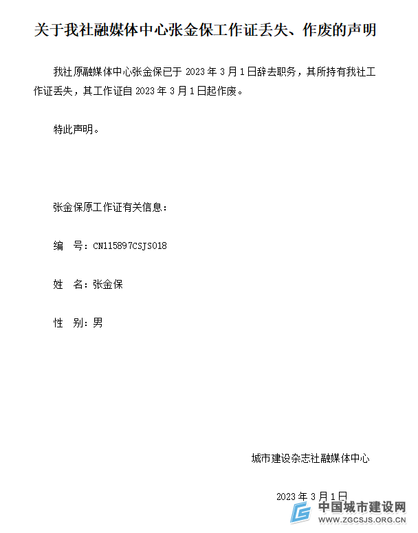 關(guān)于我社融媒體中心張金保工作證丟失、作廢的聲明