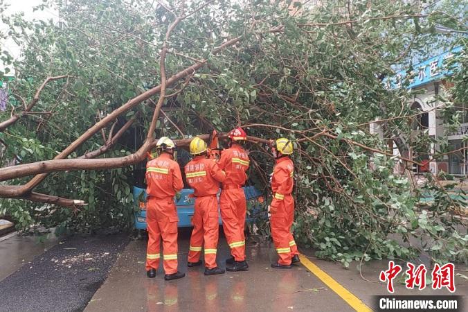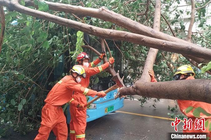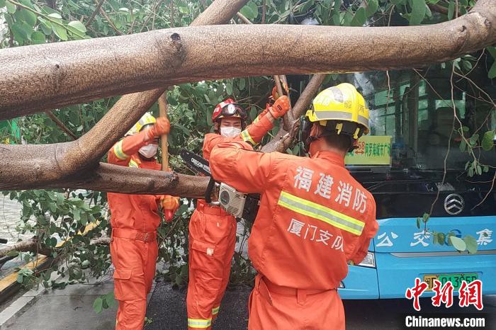 8月11日,臺(tái)風(fēng)“米克拉”吹倒廈門市區(qū)車道旁的大樹,一公交車被壓。廈門市思明區(qū)廈禾消防救援站隊(duì)員利用電鋸和斧頭等工具將樹枝切斷,轉(zhuǎn)移到路邊,清除公交車上的樹枝后,公交車才得以安全通過。