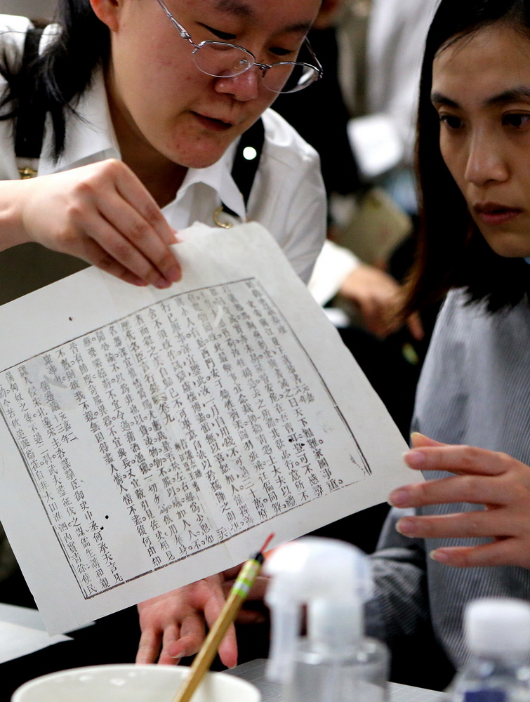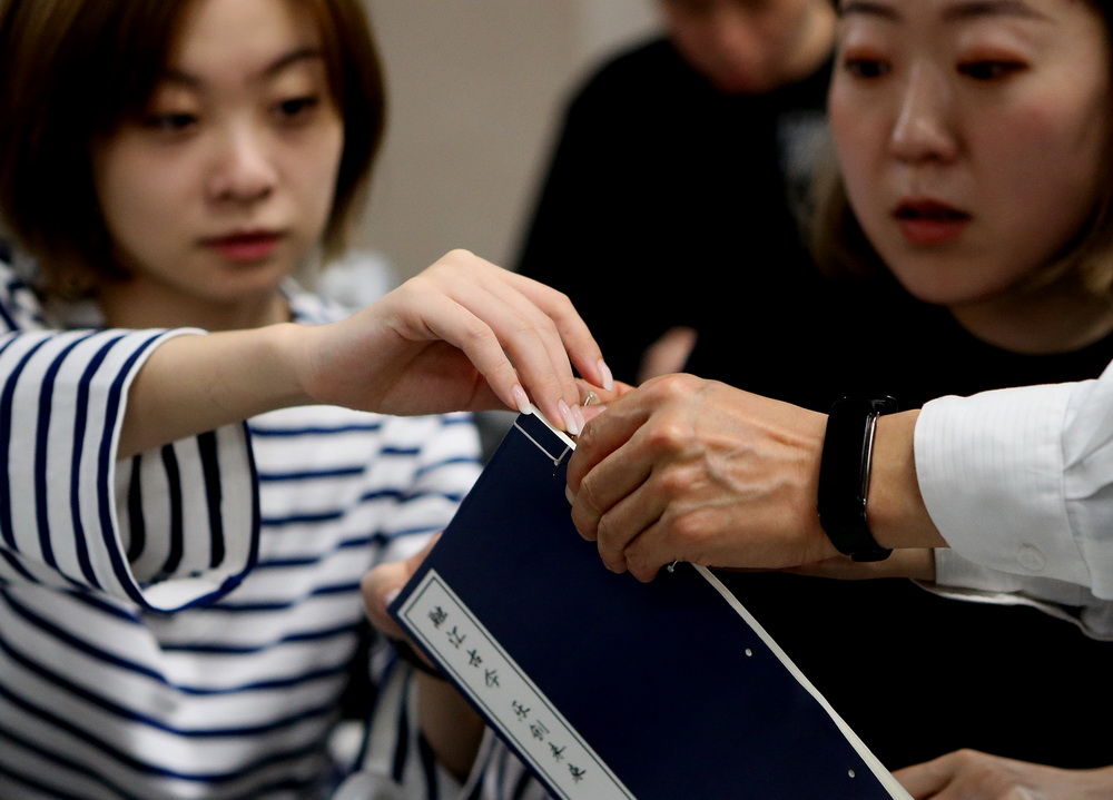 10月21日,主題為“融匯古今,樂創(chuàng)未來——非遺技藝體驗課”公益活動在上海圖書館舉行,參加活動的體驗者和古籍文獻(xiàn)修復(fù)師一起在“古籍修復(fù)”和“碑刻傳拓及拓片裝裱”兩項非遺技藝的實踐中,體會優(yōu)秀傳統(tǒng)文化的源遠(yuǎn)流長。新華社記者 陳飛 攝