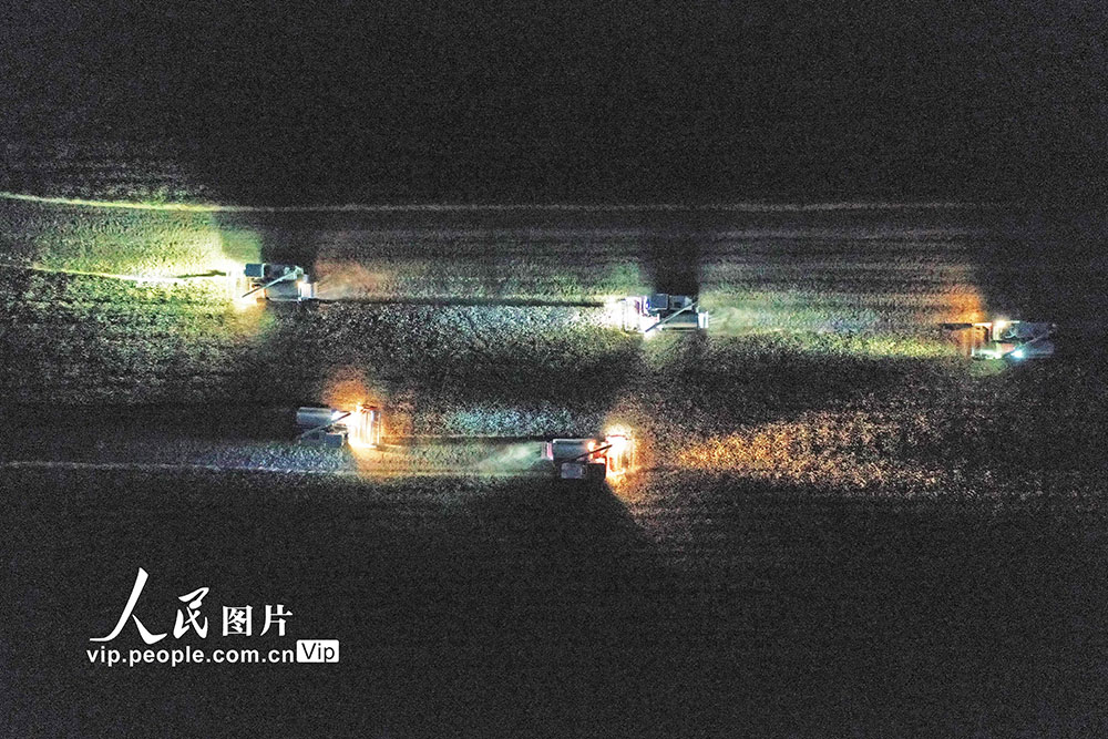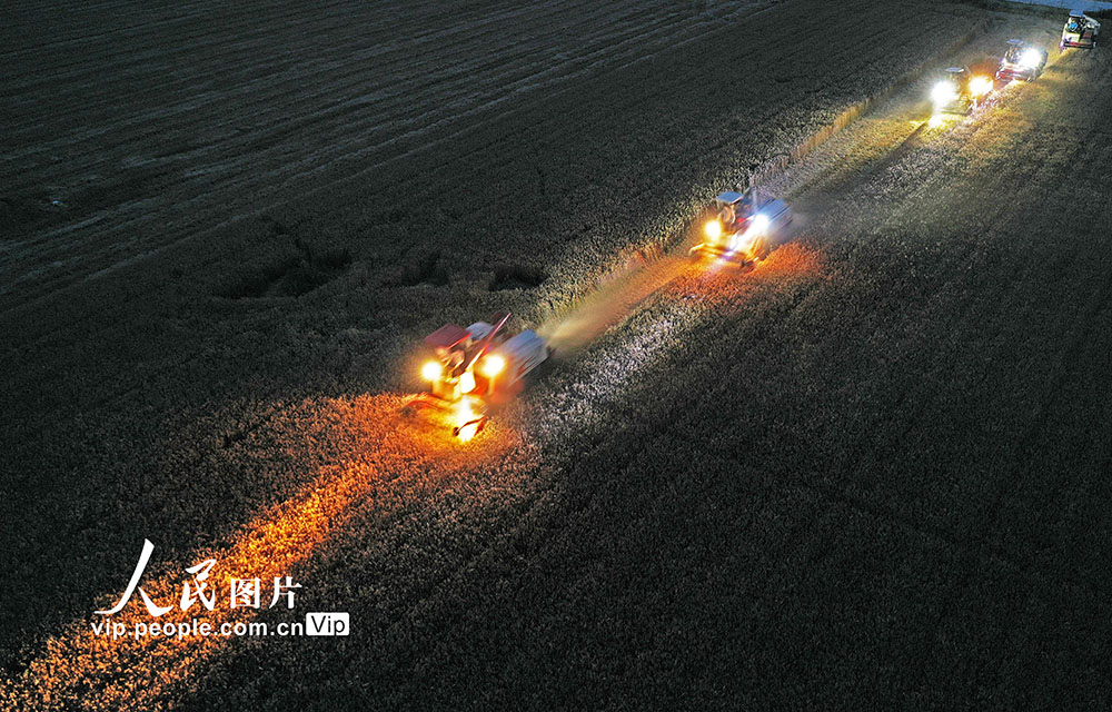 地處洪澤湖西畔的江蘇省宿遷市泗洪縣是著名的產(chǎn)糧大縣,全縣共種植小麥137萬畝。進入5月下旬以來,該縣干群抓住天氣晴好時機,積極組織人力、機械晝夜搶收成熟的小麥,確保糧食顆粒歸倉。許昌亮攝(人民圖片網(wǎng))