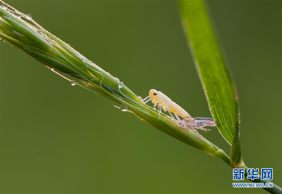 8月7日,一只剛羽化的大青葉蟬在內(nèi)蒙古呼和浩特市南湖濕地公園的花草間停留。 新華社發(fā)(丁根厚 攝)