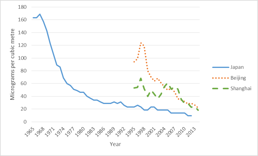 此外,中國目前正面臨的環(huán)境惡化也源于快速發(fā)展,正如過去任何工業(yè)化或快速城鎮(zhèn)化的國家所面對的一樣。中國華北平原特別是北京的霧霾問題,讓人想起20世紀(jì)50年代倫敦和60年代東京所經(jīng)歷的空氣污染。1952年的倫敦?zé)熿F事件導(dǎo)致4000人死亡,大量居民患上呼吸系統(tǒng)疾病(Greater London Authority 2002),其至今仍是官方記載的“世界上最嚴(yán)重的空氣污染災(zāi)難”(Lean 2012)。如圖1.1顯示,以二氧化硫濃度計(jì)算的話,北京和上海的空氣污染程度與上世紀(jì)60年代日本的污染程度相當(dāng)。