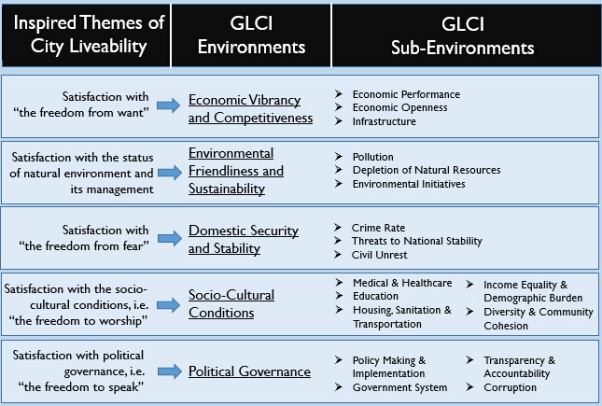 大中華宜居城市指數(shù)是建立在陳企業(yè)等人(2012)的城市宜居框架基礎(chǔ)上,該框架名為“全球宜居城市指數(shù)”。該框架由陳企業(yè)、胡永泰等人(2014)(Tan, Woo & Aw (2014))以及陳企業(yè)、胡永泰和Boon Seng Tan (2014)(Tan, Woo & Tan (2014))進(jìn)一步發(fā)展和詮釋。該框架的概念靈感來自美國前總統(tǒng)富蘭克林·D·羅斯福的1941年國情咨文演講。富蘭克林當(dāng)時提及人類的四大自由:即免于匱乏的自由,免于恐懼的自由,宗教自由以及言論自由。