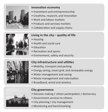 城市基礎(chǔ)設(shè)施和公共事業(yè) · 流動性,交通和停車 · 節(jié)能,智能電網(wǎng)和可再生能源 · 水資源管理和節(jié)約 · 廢棄物管理和物價穩(wěn)定 · 寬帶,有線和無線網(wǎng)絡(luò) |